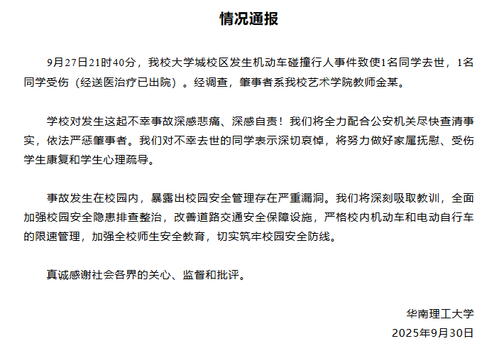 9月27日21时40分,我校大学城校区发生机动车碰撞行人事件致使1名同学去世,1名同学受伤(经送医治疗已出院)。经调查,肇事者系我校艺术学院教师金某。